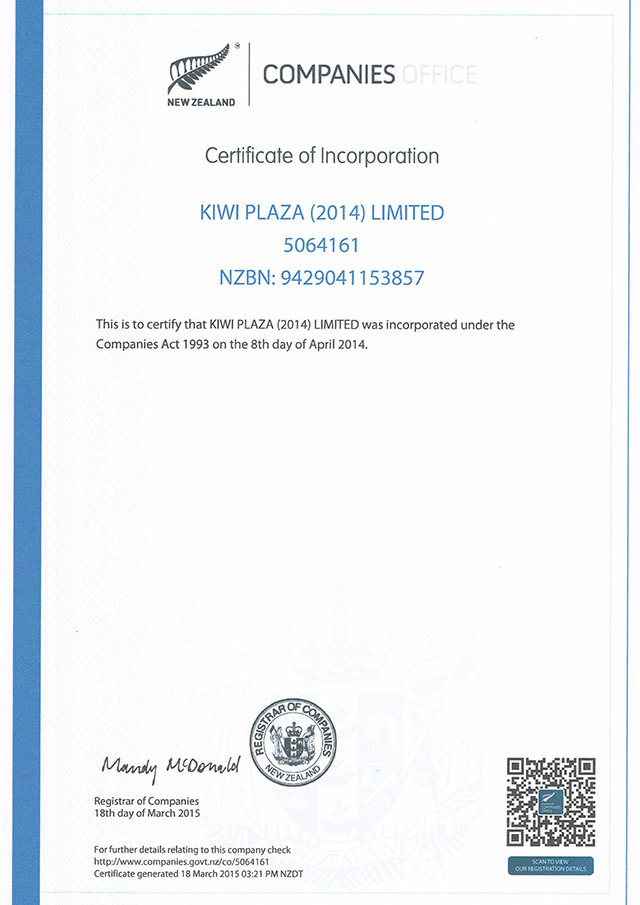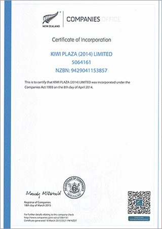KIWI PLAZA COMPANY CERT