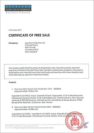 CERTIFICATE OF FREE SALE –BEE VENOM SERIES